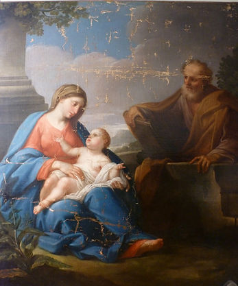 Le tableau auparavant restauré, à ses repeints qui ont viré de couleurs, et quelques soulèvements sont apparus.